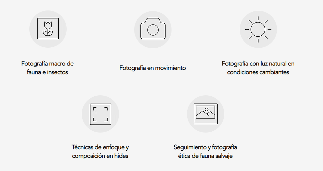 Estos talleres están diseñados tanto para aficionados avanzados como para fotógrafos profesionales que deseen perfeccionar sus habilidades en condiciones reales de campo. Cada workshop se centra en especies concretas (como el lince ibérico, aves rapaces, anfibios o pequeñas aves forestales) o en el dominio de técnicas fotográficas especializadas.